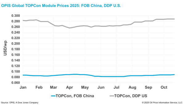 - According to the OPIS Solar Weekly Report released on October 21, The Chinese Module Marker (CMM), OPIS’s benchmark for TOPCon modules above 600W, rose 1.14% to $0.089/W Free-On-Board (FOB) China, with indications between $0.086-0.093/W.