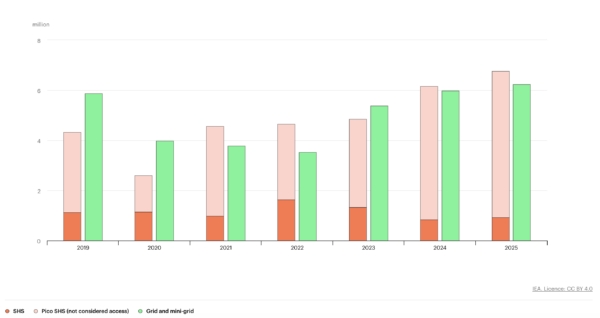 While the sale of solar home systems (SHS) grew by 4% last year globally, according to figures posted by off-grid solar association Gogla, Sub-Saharan Africa recorded a 26% increase in new primary users. But IEA’s analysis points out that the majority of these are very small systems, up to 10 W in capacity, and therefore fall short of its definition of access. Excluding these sales means SHS connections were down from their 2022 peak.